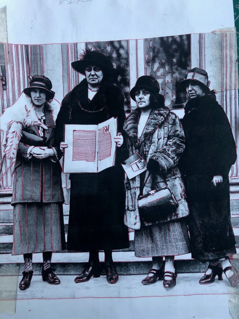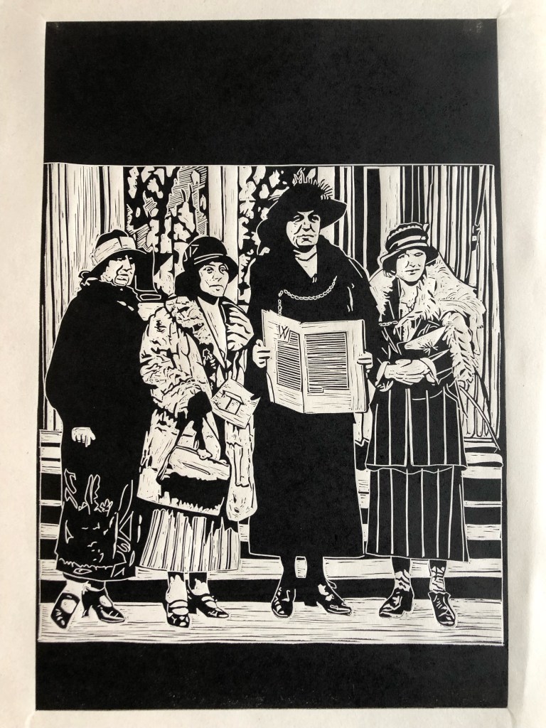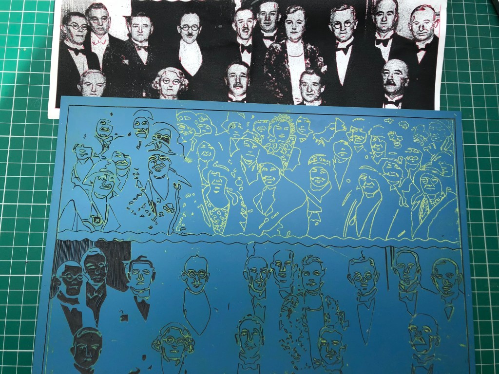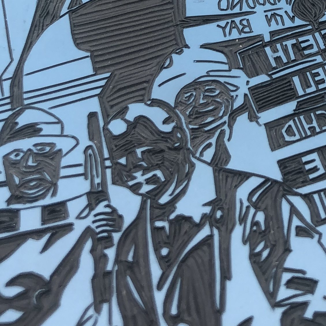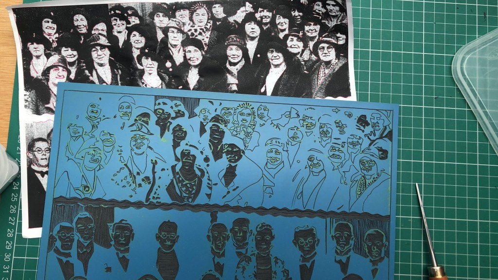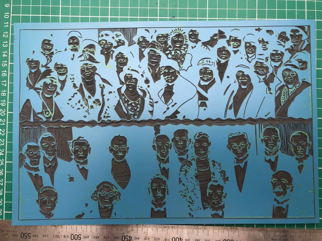 The faces are a real challenge and so I have learnt to go very slowly. It is useful using a historical image as you don’t have the person depicted looking critically over your shoulder for accuracy (or a flattering portrait). However I made some critical errors here. Most clearly seen in the three ladies above the banner to the right of the block. I decided that they could have white features carved out of black faces as they were further back in the image and therefore less clear, in much the same way as the lettering in the background is reversed out. The faces looked terrible, and I had to do a hasty repair job to salvage them.