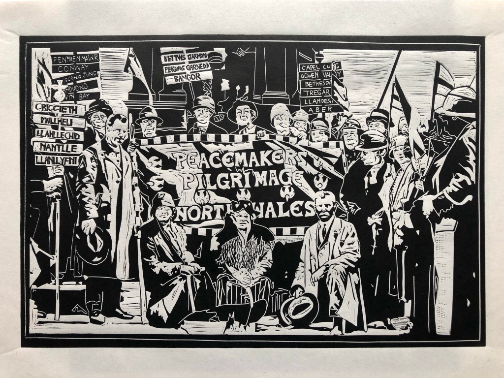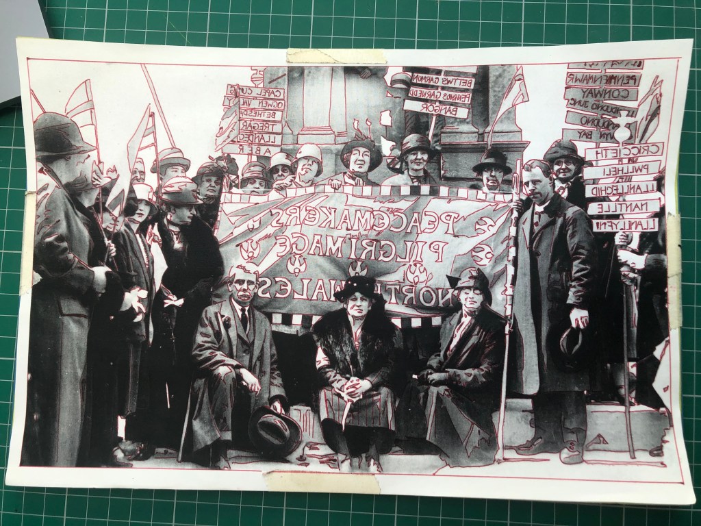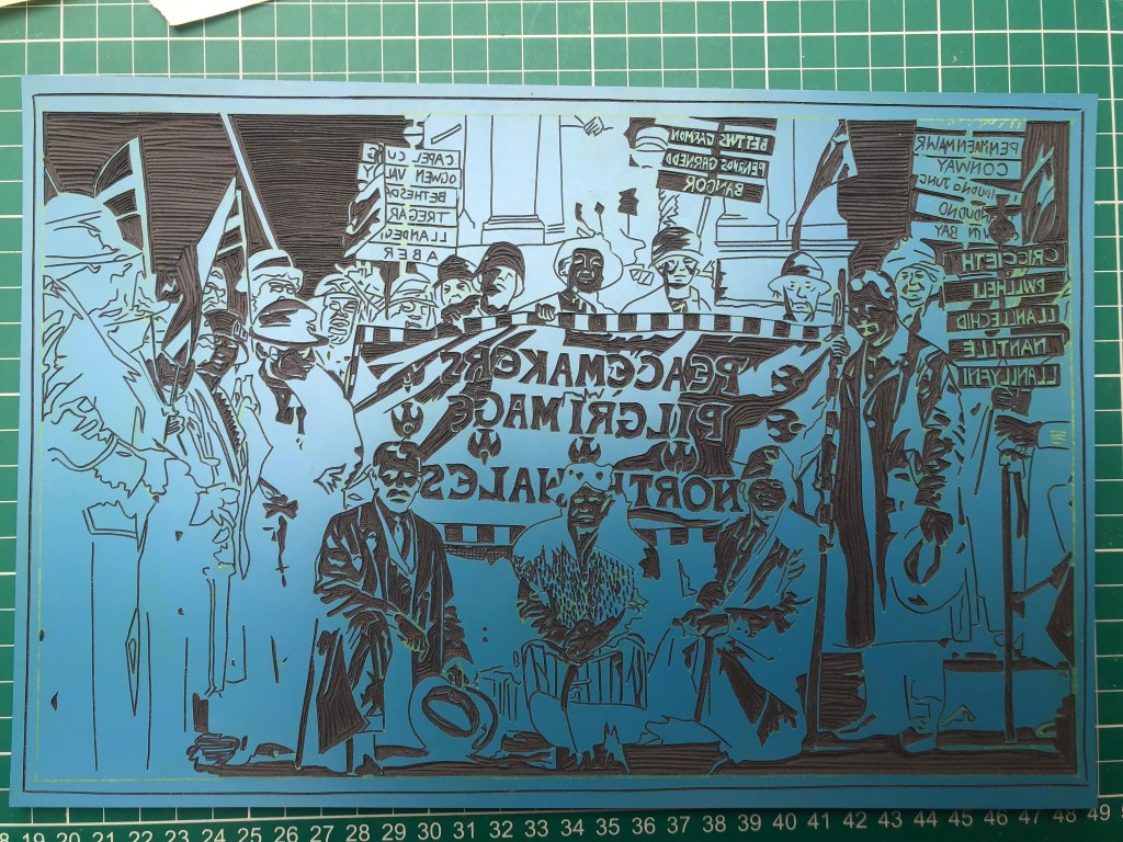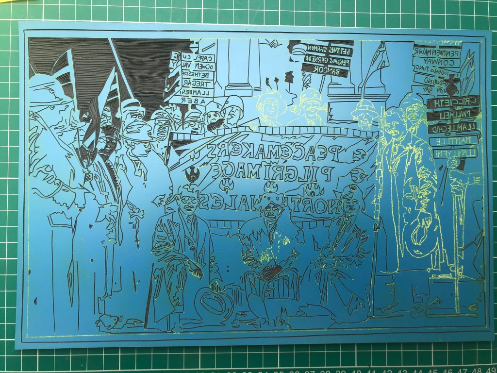 Following my work on the inauguration of the Temple of Peace in Cardiff, I have become fascinated, and inspired by the women’s peace movements that have taken place in Cardiff during the past century. The stories of the people depicted in my latest series of linocuts will be the subject of my next blog. However I have been taking photos as I go along, so I thought I would share them here for those who might be interested in my process.